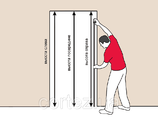 Другий не менш важливий параметр - висота дверного отвору, який також вимірюється у трьох точках: у центрі та двох бокових укосів. Зверніть увагу, що висота визначається після укладання покриття для підлоги, товщина якого може досягати 1-2 см, що неодмінно вплине на розміри дверного полотна.