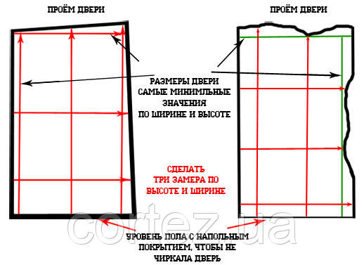 Проріз вхідних дверей має свої особливості вимірювання, його проводять у 6 точках на кожен параметр усередині та зовні приміщення.